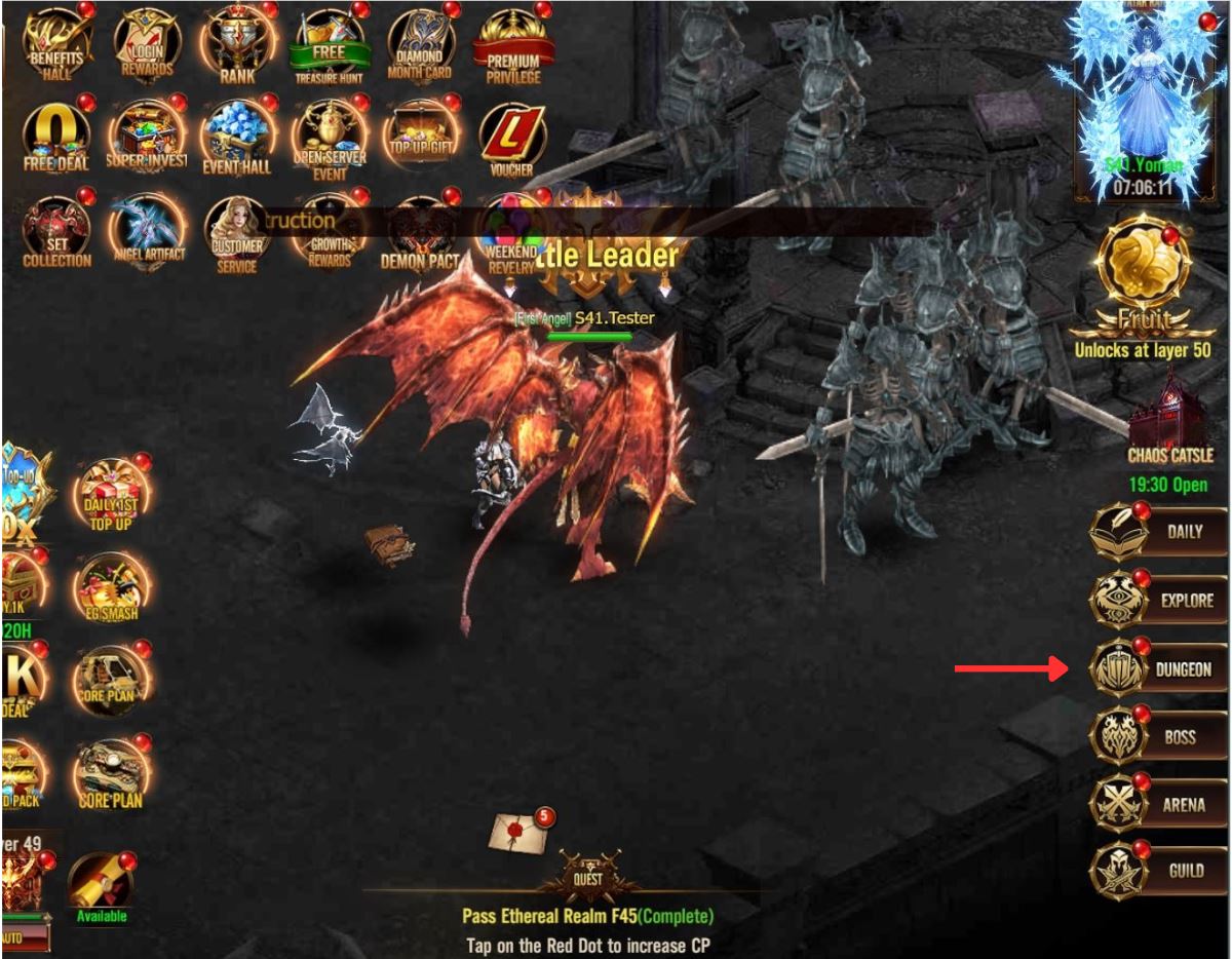 After completing the next series of quests, the Dungeon system will be unlocked. Countless dungeons await your exploration.